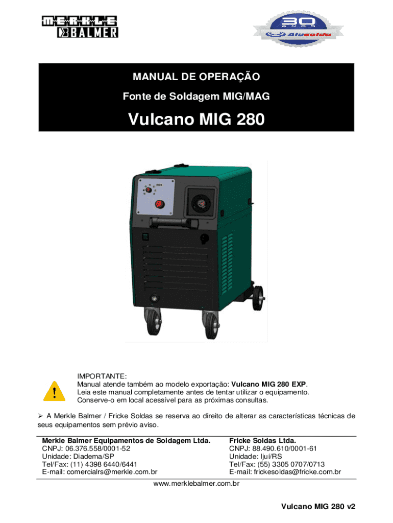 MANUAL DE OPERAO Fonte de Soldagem MIG/MAGVulcano MIG 280IMPORTANTE: Manual atende tambm ao modelo exportao: Vulcano MIG 280 EXP. Leia este manual completamente antes de tentar utilizar o equipamento. Conserveo em local acessvel para as prximas consultas. A Merkle Balmer / Fricke Soldas se reserva ao direito de alterar as caractersticas tcnicas de seus equipamentos sem prvio aviso. Merkle Balmer Equipamentos de Soldagem Ltda. CNPJ: 06.376.558/000152 Unidade: Diadema/SP Tel/Fax: