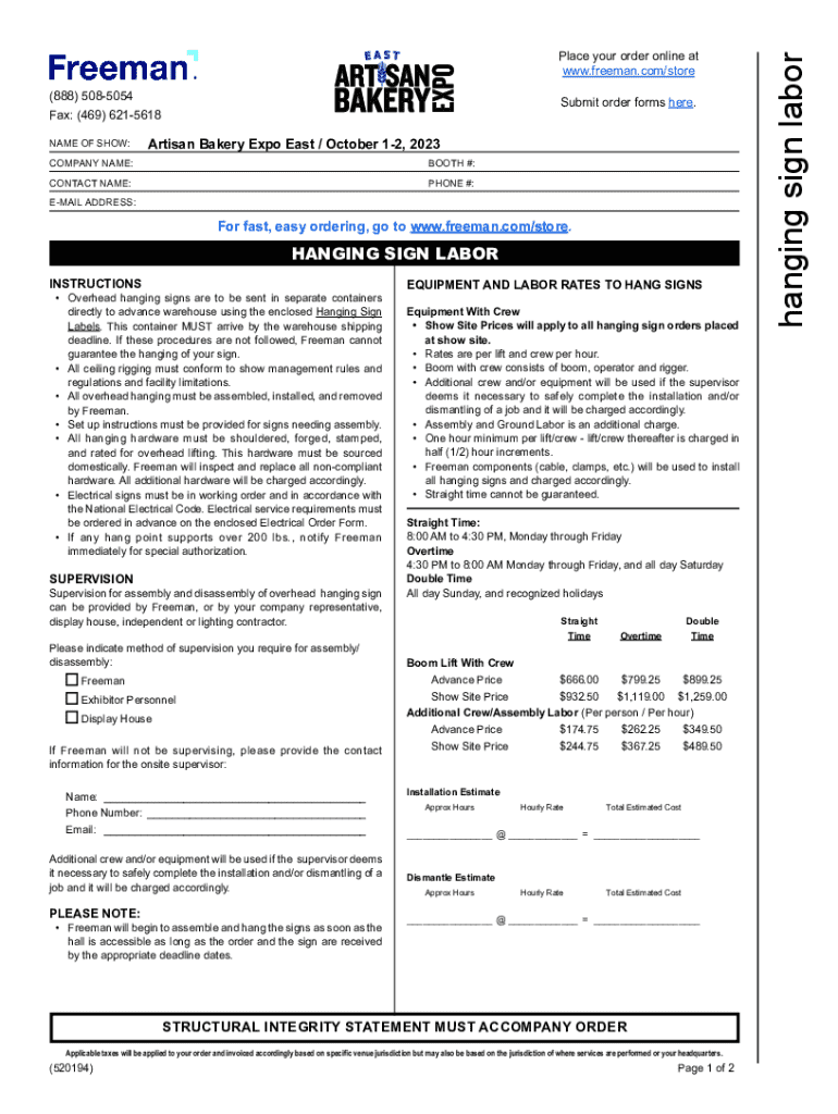 (888) 5085054 Fax: (469) 6215618 NAME OF SHOW:Submit order forms here.Artisan Bakery Expo East / October 12, 2023COMPANY NAME:BOOTH #:CONTACT NAME:PHONE #:EMAIL ADDRESS:For fast, easy ordering, go to www.freeman.com/store.HANGING SIGN LABOR INSTRUCTIONS Overhead hanging signs are to be sent in separate containers directly to advance warehouse using the enclosed Hanging Sign Labels. This container MUST arrive by the warehouse shipping deadline. If these procedures are not