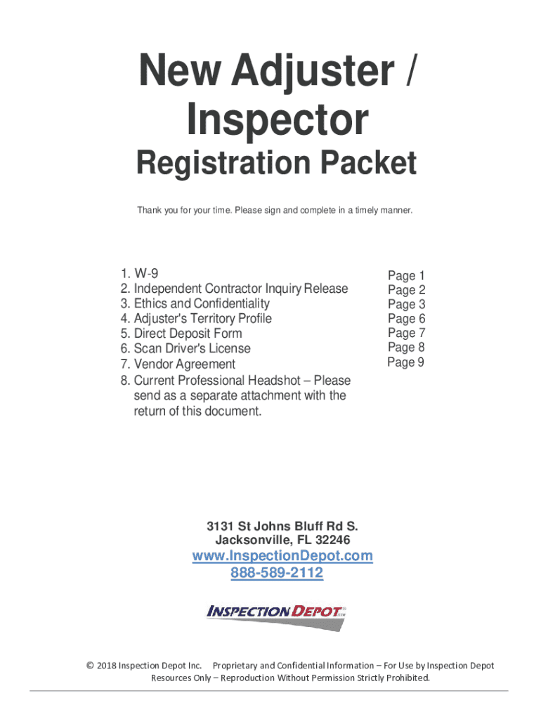 This registration packet includes essential documents for new adjusters or inspectors, including forms, ethical guidelines, and information necessary for completing the registration process with Inspection Depot.