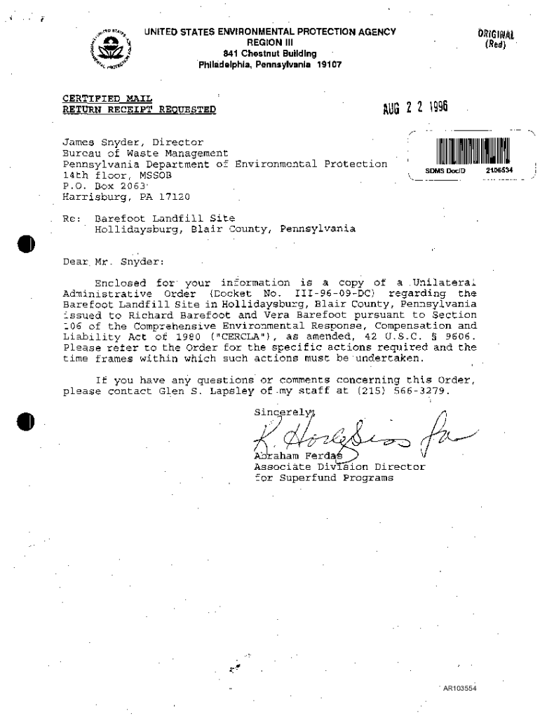 UNITED STATES ENVIRONMENTAL PROTECTION AGENCY REGION III 841 Chestnut Building Philadelphia, Pennsylvania 19107CERTIFIED MAIL RETURN RECEIPT REOUESTEDAUG 2 2 1996James Snyder, Director Bureau of Waste