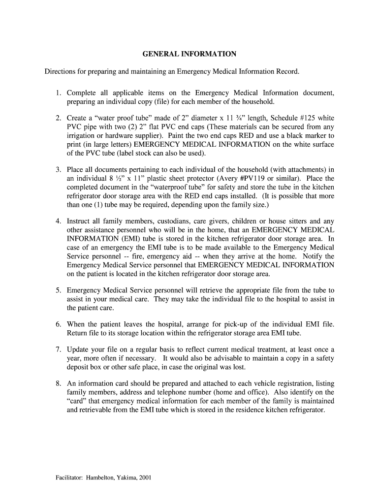 GENERAL INFORMATION Directions for preparing and maintaining an Emergency Medical Information Record. 1. Complete all applicable items on the Emergency Medical Information document, preparing an individual