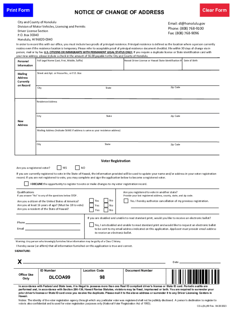 This form is used to notify the Division of Motor Vehicles, Licensing and Permits in Honolulu about a change of address. It requires proof of principal residence and can update voter registration
