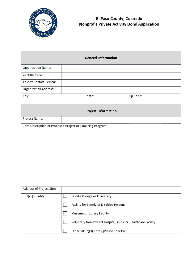 This application is intended for nonprofit organizations seeking private activity bonds in El Paso County, Colorado. It includes sections for general organization information, project details, financial information, and an attestation confirming compliance with relevant codes and regulations.