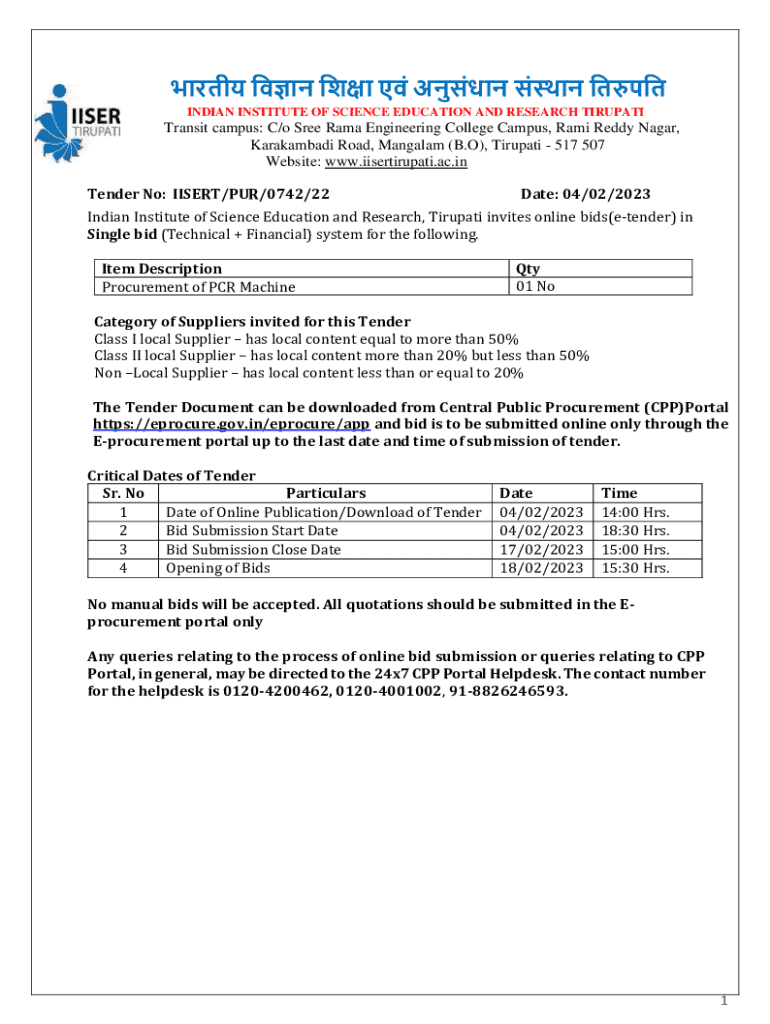 Get the free Tender No: IISERT/PUR/0742/22