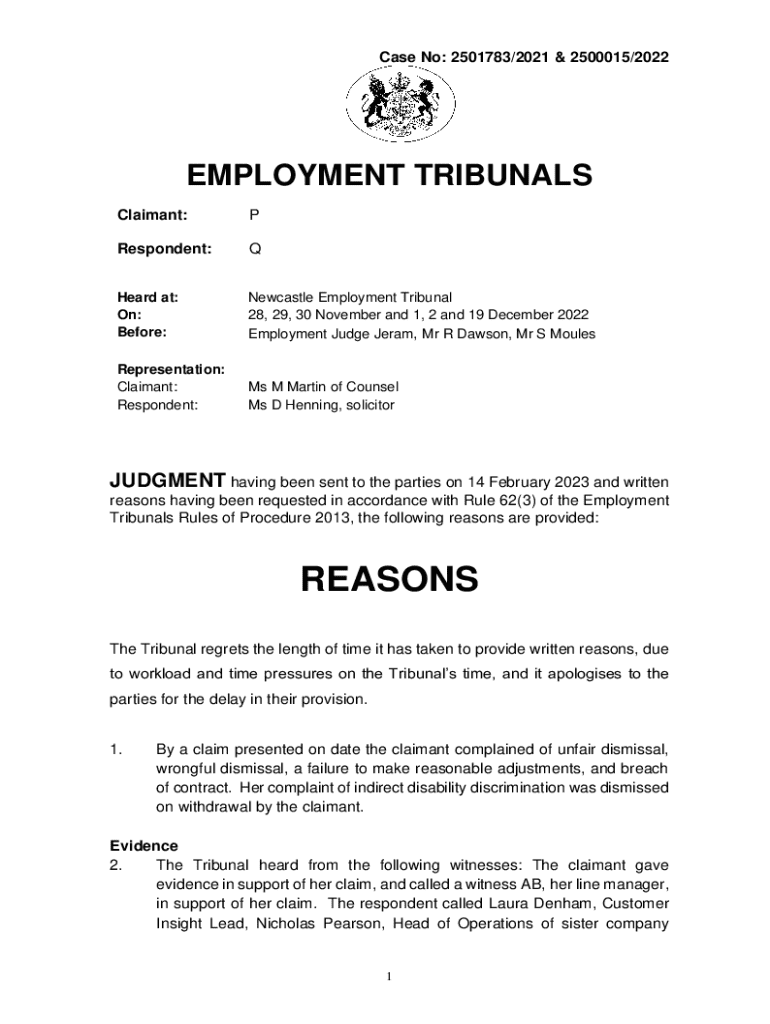 Case No: 2501783/2021 & 2500015/2022EMPLOYMENT TRIBUNALS Claimant:PRespondent:QHeard at: On: Before:Newcastle Employment Tribunal 28, 29, 30 November and 1, 2 and 19 December 2022 Employment Judge