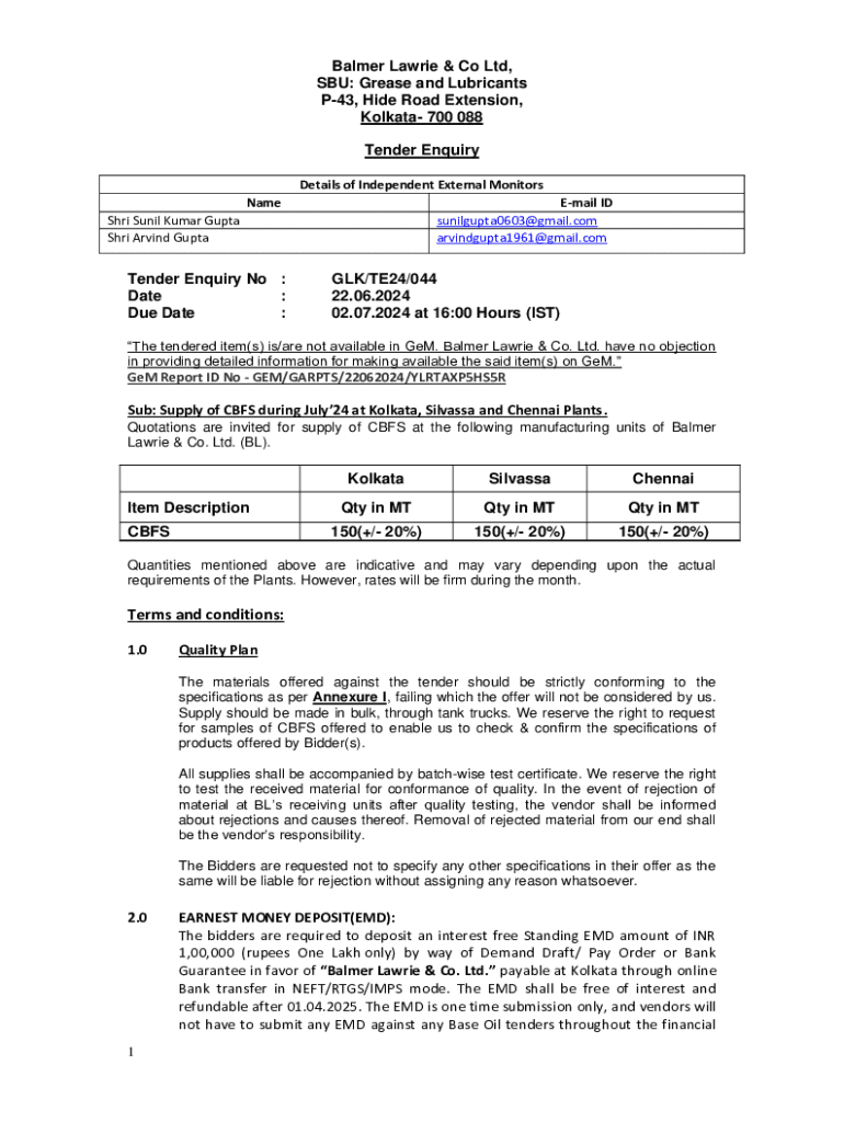 Balmer Lawrie & Co Ltd, SBU: Grease and Lubricants P43, Hide Road Extension, Kolkata 700 088 Tender Enquiry Details of Independent External Monitors NameEmail ID sunilgupta0603@gmail.com arvindgupta1961@gmail.comShri
