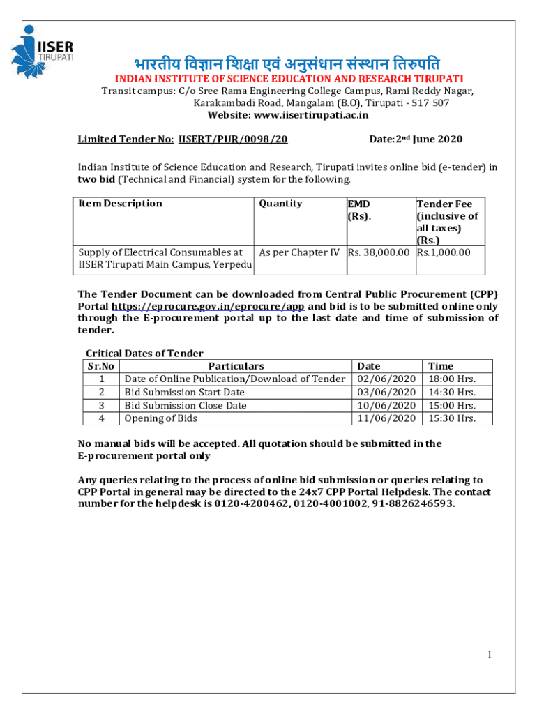 INDIAN INSTITUTE OF SCIENCE EDUCATION AND RESEARCH TIRUPATI Transit campus: C/o Sree Rama Engineering College Campus, Rami Reddy Nagar, Karakambadi Road, Mangalam (B.O), Tirupati 517 507 Website: www.iisertirupati.ac.in Limited Tender No: IISERT/PUR/0098/20Date:2nd June 2020Indian Institute of Science Education and Research, Tirupati invites online bid (etender) in two