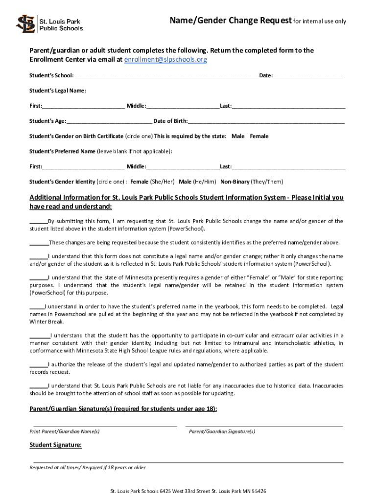 This form is used to request changes to a student\'s name and/or gender in the St. Louis Park Public Schools student information system, reflecting how the student consistently identifies. It provides a record of changes for access to facilities and participation in activities consistent with the student\'s gender identity.