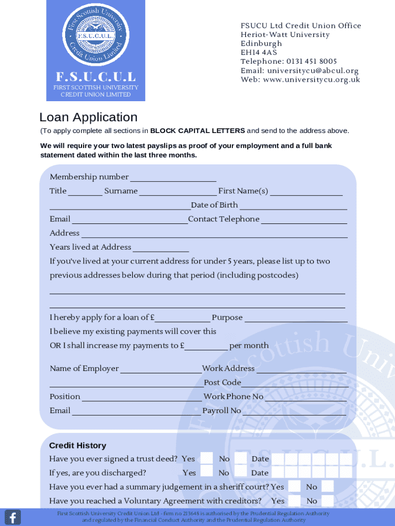 This document is a loan application form for members of the First Scottish University Credit Union Limited. It includes sections for personal information, employment details, credit history, and a declaration confirming the accuracy of the provided information and acceptance of the terms related to the loan application.