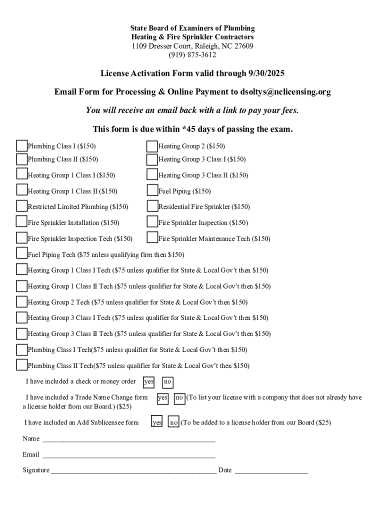 This form is used to activate various plumbing and heating contractor licenses. It is valid through 9/30/2025 and must be submitted within 45 days of passing the relevant exam. Payment is processed