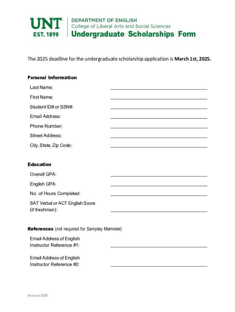 This form is for applying to various undergraduate scholarships available for students at UNT for the academic year 2025. It includes sections for personal information, education details, references,