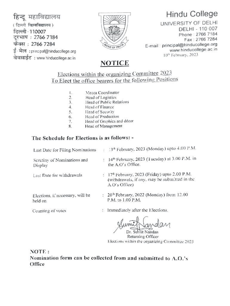 This document serves as a notice for the upcoming elections within the organizing committee at Hindu College, University of Delhi, outlining the positions available, election schedule, and procedures for filing nominations.
