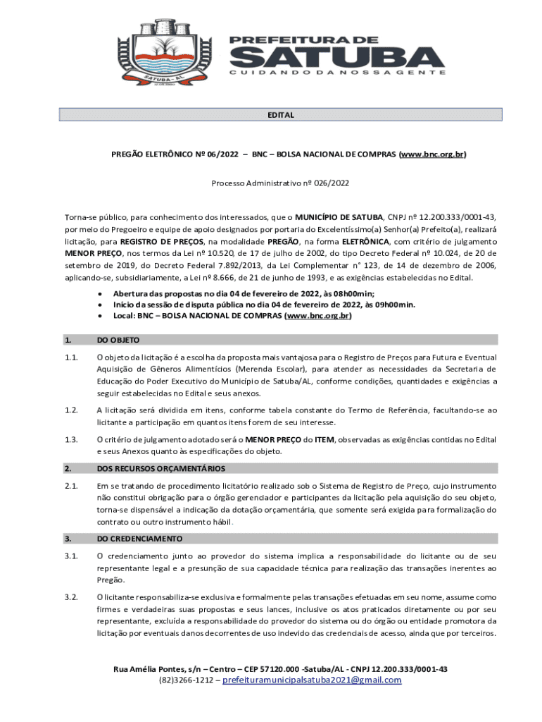 O edital torna público a realização de licitação pelo Município de Satuba para o Registro de Preços visando à futura aquisição de gêneros alimentícios destinados à merenda escolar, com regras e exigências definidas conforme as normas legais pertinentes.