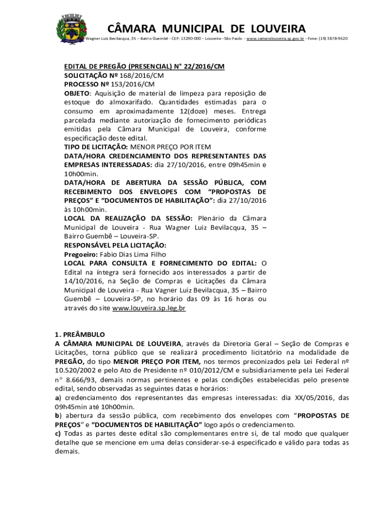 CMARA MUNICIPAL DE LOUVEIRA Rua Wagner Luiz Bevilacqua, 35 Bairro Guemb CEP: 13290000 Louveira So Paulo www.camaralouveira.sp.gov.br Fone: (19) 38789420EDITAL DE PREGO (PRESENCIAL) N 22/2016/CM SOLICITAO