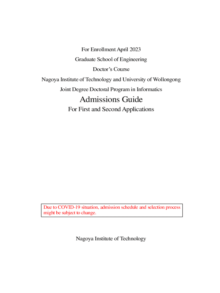 For Enrollment April 2023 Graduate School of Engineering Doctors Course Nagoya Institute of Technology and University of Wollongong Joint Degree Doctoral Program in InformaticsAdmissions Guide For First and Second ApplicationsDue to COVID19 situation, admission schedule and selection process might be subject to change.Nagoya Institute of TechnologyGraduate School of Engineering Doctors Course Nagoya Institute of Technology and University of Wollongong Joint Degree Doctoral Program