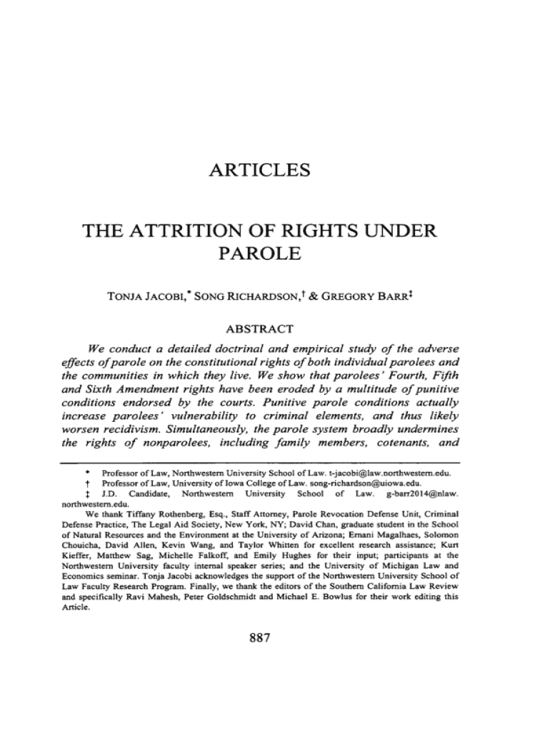 ARTICLES THE ATTRITION OF RIGHTS UNDER PAROLE TONJA JACOBI,* SONG RICHARDSON, 1 & GREGORY BARR ABSTRACTWe conduct a detailed doctrinal and empirical study of the adverse effects ofparole on the constitutionalrights