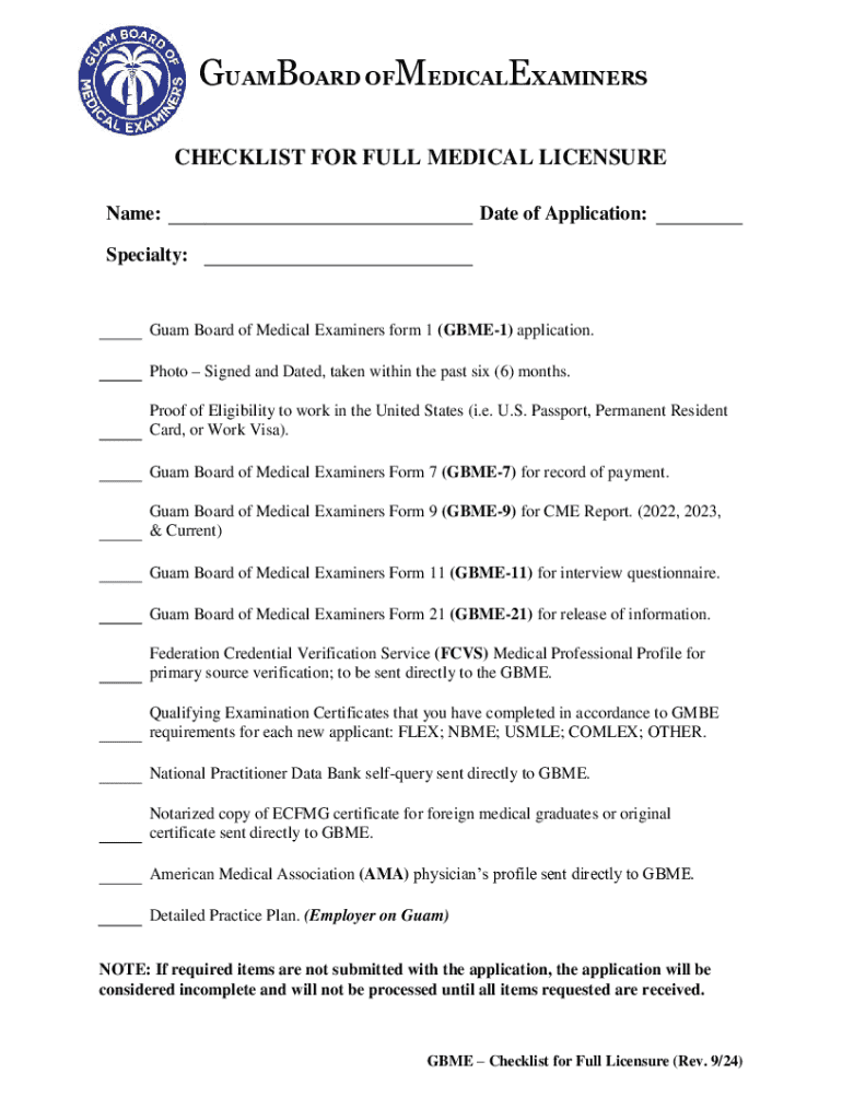 Este formulario es una solicitud para obtener la licencia médica completa en Guam. Incluye instrucciones y requisitos que deben seguirse cuidadosamente para asegurar el procesamiento oportuno de la solicitud, así como un checklist para garantizar que todos los documentos necesarios sean enviados.