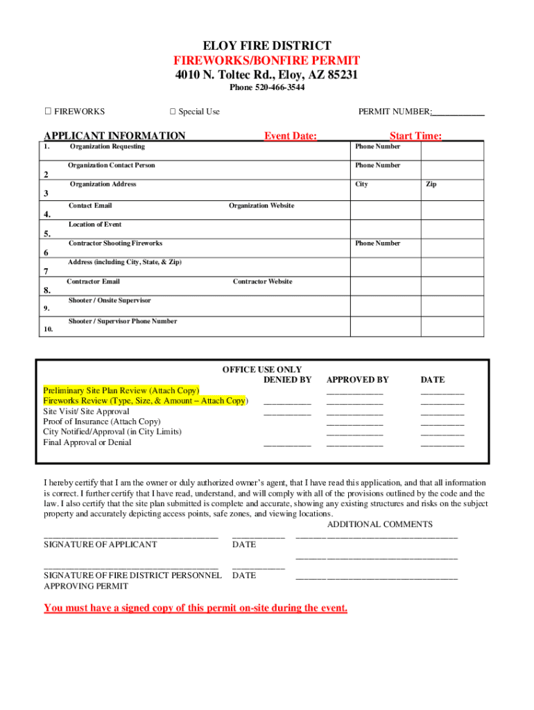 To fill out a fireworksbonfire permit, applicants must provide information such as the event location, date and time, type of fireworks or bonfire, and details about safety measures.