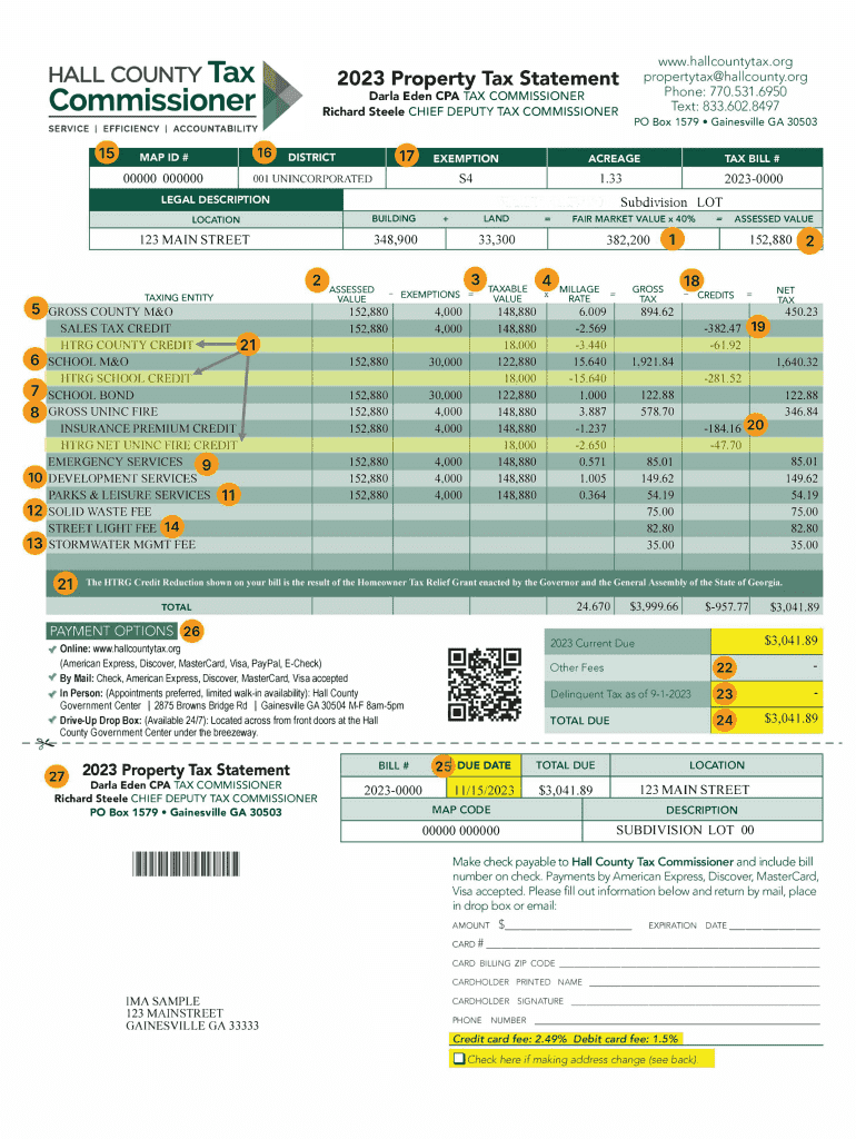 The 2023 property tax statement must report information such as property identification numbers, property location, assessed value, tax rates, exemptions, and total tax due.