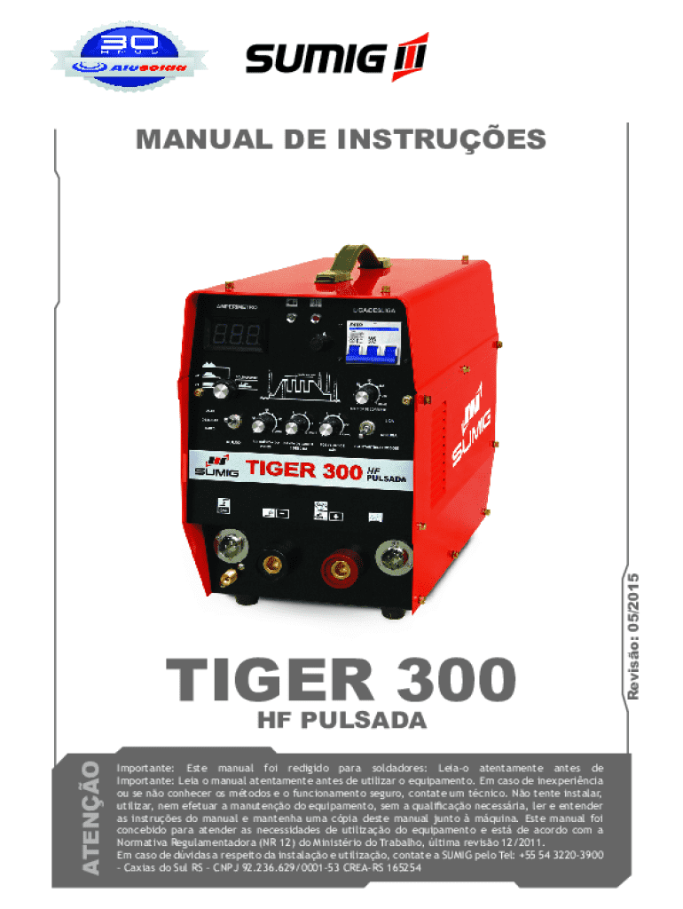 Este manual foi redigido para soldadores e contém instruções detalhadas sobre o uso seguro e eficaz do equipamento TIGER 300, incluindo normas de segurança, instalação, operação e manutenção. Destaca a importância de seguir as orientações para evitar riscos à saúde e segurança durante o processo de soldagem.