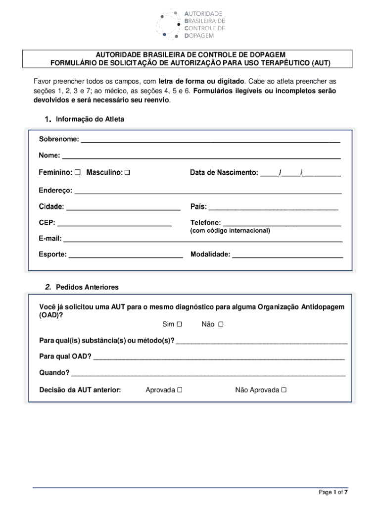 Este formulário é utilizado por atletas para solicitar autorização para uso terapêutico de substâncias proibidas, incluindo informações sobre solicitações anteriores, justificativas médicas e declarações do atleta e do médico.