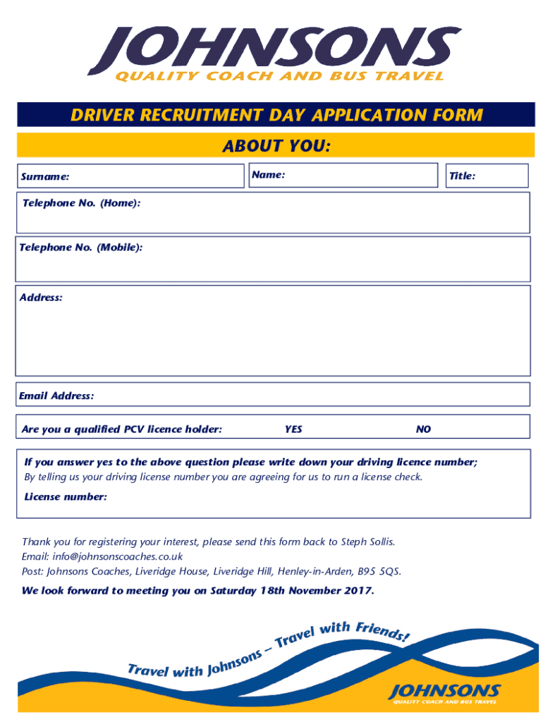 This form is used for applicants to register their interest in the Driver Recruitment Day, providing personal details and license information.