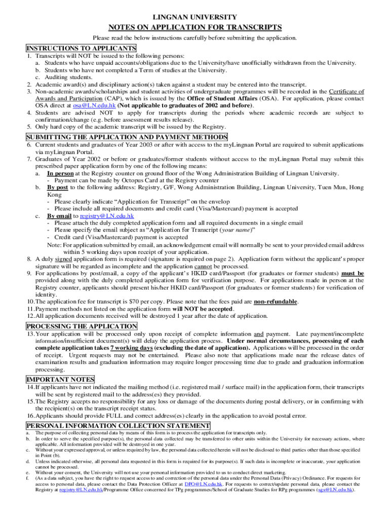 This form is for graduates of Year 2002 or before or graduates/former students without access to the myLingnan Portal to apply for transcripts. It includes instructions for application submission, payment methods, and personal information collection.