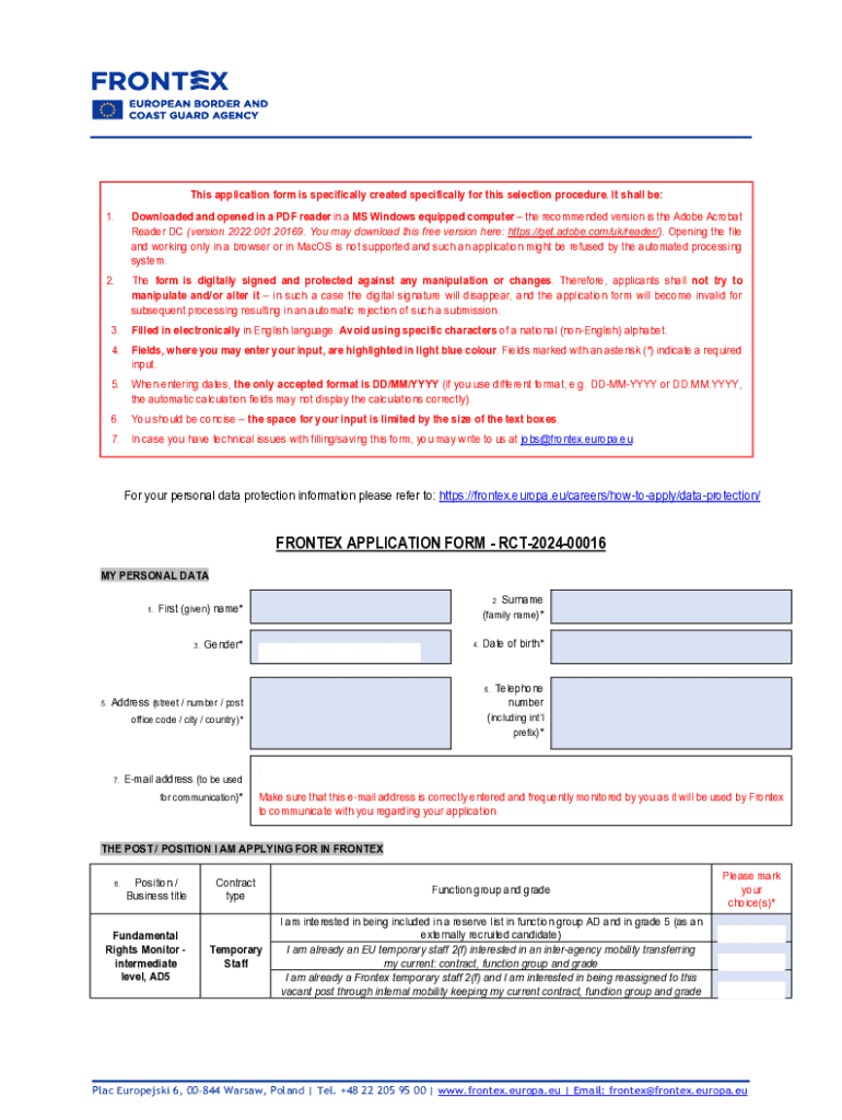 This application form is specifically created specifically for this selection procedure. It shall be: 1.Downloaded and opened in a PDF reader in a MS Windows equipped computer the recommended version is the Adobe Acrobat Reader DC (version 2022.001.20169. You may download this free version here: https://get.adobe.com/uk/reader/). Opening the file and working only in a browser or in MacOS is not supported and such an application might be refused by the automated processing system.2.The form