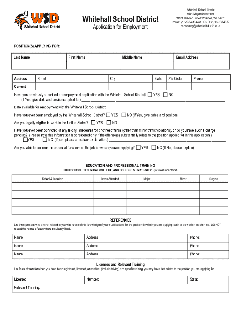 This application form is intended for individuals applying for employment with the Whitehall School District. It collects personal information, educational background, employment history, references, and additional statements required for evaluation.