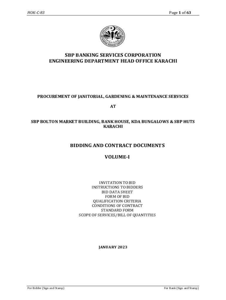 This document outlines the bidding and contract terms for the procurement of janitorial, gardening, and maintenance services at various locations in Karachi, including SBP Bolton Market building,