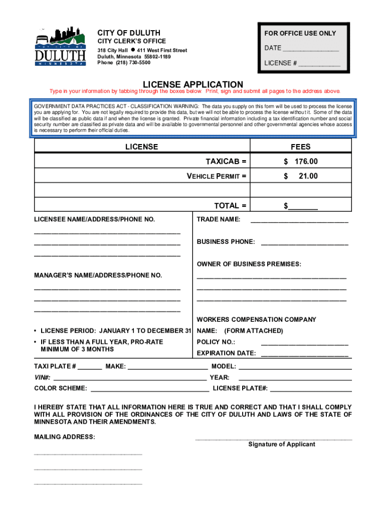 This document is a license application for taxi services within the City of Duluth. It requires the applicant to provide necessary information, including personal details, vehicle information, and compliance with state laws. Additional sections for taxi driver information and rate registration are included.
