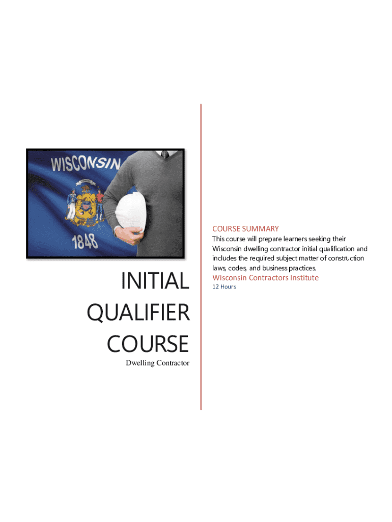 COURSE SUMMARYINITIAL QUALIFIER COURSE Dwelling ContractorThis course will prepare learners seeking their Wisconsin dwelling contractor initial qualification and includes the required subject matter of construction laws, codes, and business practices.Wisconsin Contractors Institute 12 HoursCourse Outline: Chapter 1: Licensing, Certification & Registration Chapter 1 is based on Wisconsin Chapter SPS 305. Only information pertaining to licenses, certifications and registrations regarding Dwelling