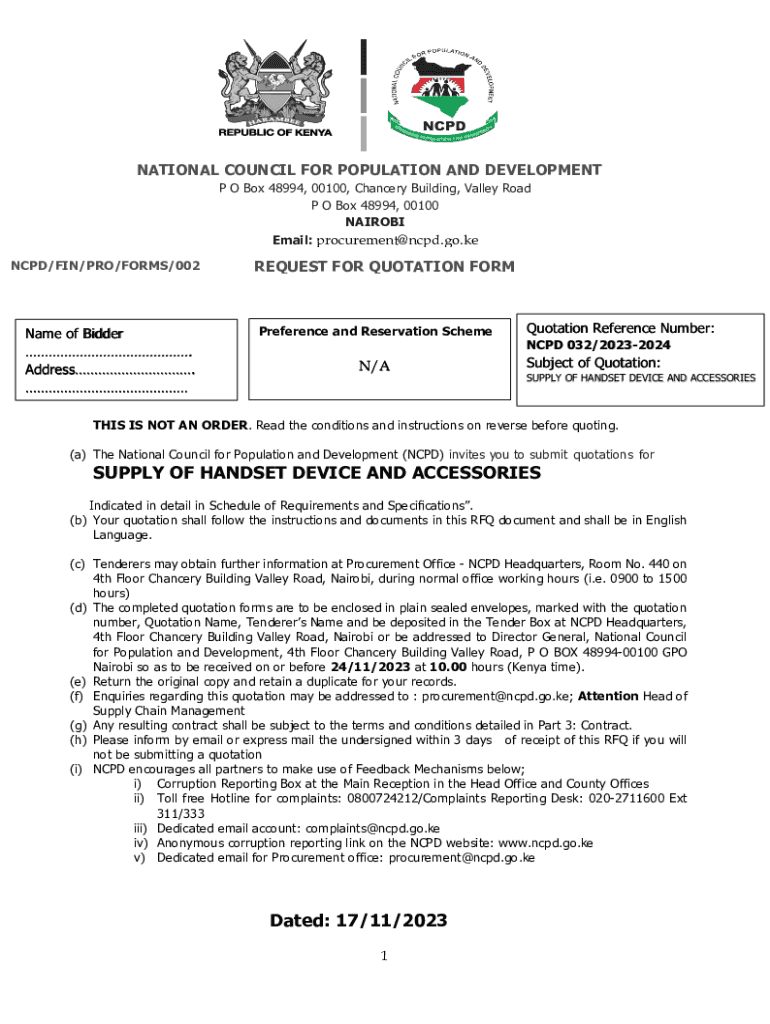This document outlines the request for quotations by the National Council for Population and Development for the supply of handset devices and accessories. It includes instructions for bidders, eligibility criteria, submission guidelines, and details regarding the evaluation of quotations.