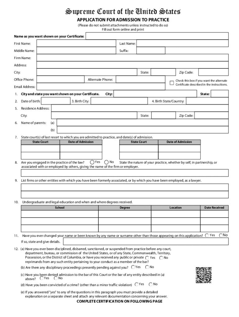 This form is used to apply for admission to practice law before the Supreme Court of the United States. It requires personal information, educational background, legal practice details, and certification from sponsors who are members of the Bar.