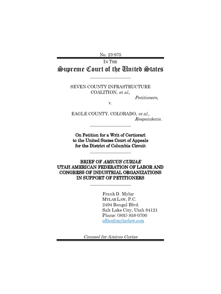 This document presents the arguments of the Utah AFL-CIO in support of the petitioners regarding the Uinta Basin Railway Project, emphasizing its potential for job creation and economic growth while critiquing the lower court\'s decision as arbitrary and inconsistent.
