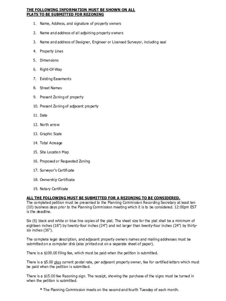 This document outlines the necessary information and requirements for submitting a petition for rezoning including details about property owners, property dimensions, zoning classifications, and associated