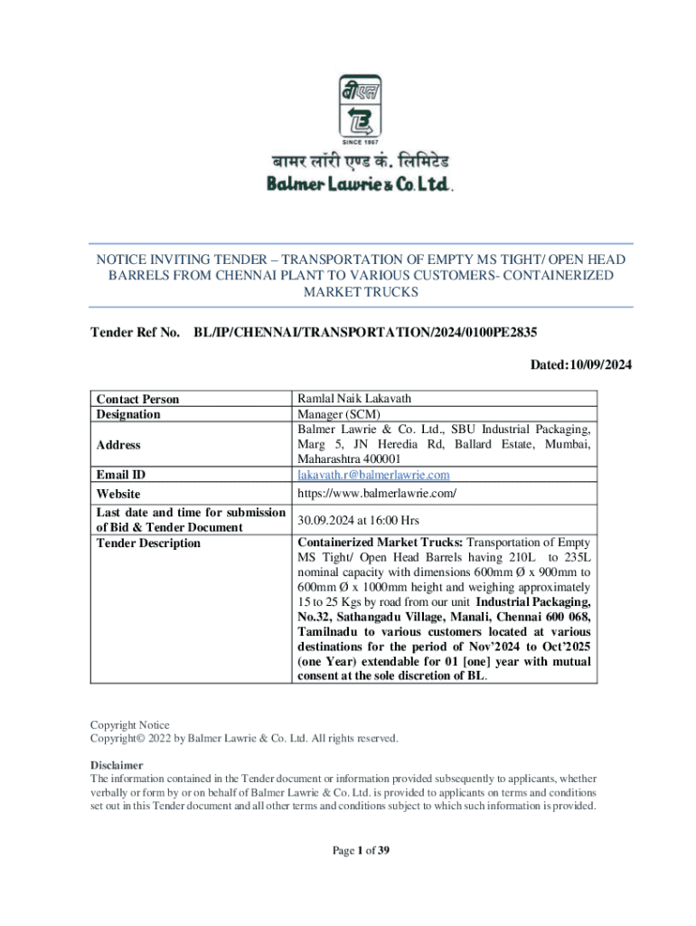 Notice inviting tender for the transportation of empty MS tight/open head barrels from Chennai plant to various customers using containerized market trucks for the period of Nov 2024 to Oct 2025.