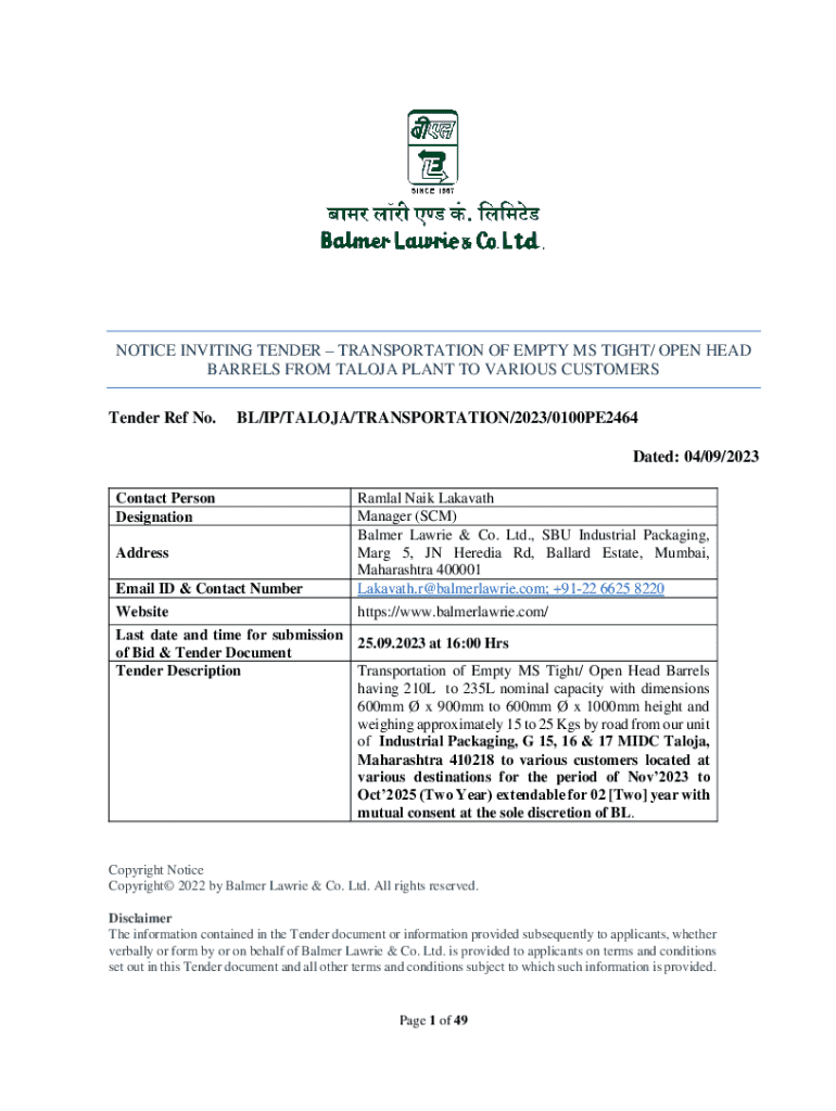 NOTICE INVITING TENDER TRANSPORTATION OF EMPTY MS TIGHT/ OPEN HEAD BARRELS FROM TALOJA PLANT TO VARIOUS CUSTOMERS Tender Ref No.BL/IP/TALOJA/TRANSPORTATION/2023/0100PE2464 Dated: 04/09/2023Contact