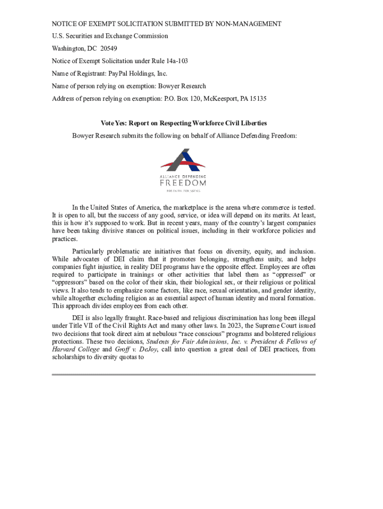 This document serves as a notice of exempt solicitation related to a shareholder proposal concerning the respect for workforce civil liberties at PayPal Holdings, Inc. It discusses issues surrounding diversity, equity, and inclusion (DEI) practices in the corporate sector, highlighting concerns regarding legal risks and workplace dynamics.