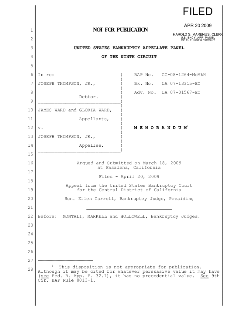 FILED APR 20 2009NOT FOR PUBLICATION1HAROLD S. MARENUS, CLERK U.S. BKCY. APP. PANEL O F TH E N IN TH C IR C U IT2 3UNITED STATES BANKRUPTCY APPELLATE PANEL4OF THE NINTH CIRCUIT5 6 7 8 9 10 11 12 13 14In re:) ) JOSEPH THOMPSON, JR., ) ) ) Debtor. ) ___) ) JAMES WARD and GLORIA WARD, ) ) Appellants, ) ) v. ) ) JOSEPH THOMPSON, JR., ) ) Appellee. ) ___)BAP No.CC081264MoMkHBk. No.LA 0713315ECAdv. No.LA 0701567ECM E M O R A N D U M115 16Argued and Submitted
