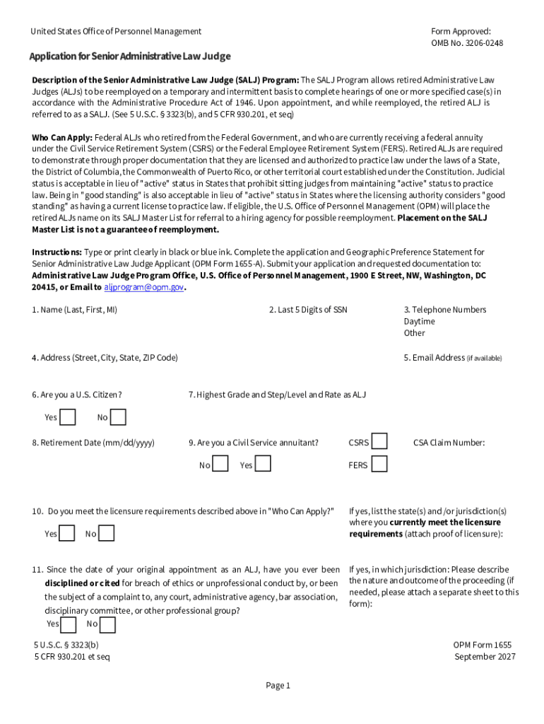 The SALJ Program allows retired Administrative Law Judges to be reemployed on a temporary basis to complete hearings in accordance with the Administrative Procedure Act. This form is to apply for
