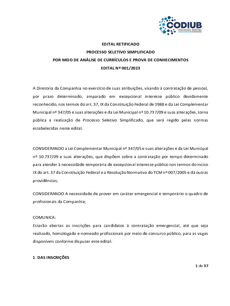 A Companhia de Desenvolvimento de Informática de Uberaba (CODIUB) torna pública a realização de Processo Seletivo Simplificado visando à contratação de pessoal por prazo determinado, conforme