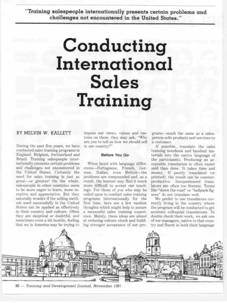 \"Training salespeople internationally presents certain problems and challenges not encountered in the United States.\"Conducting International Sales Training BY MELVIN W . KALLETTimpose our views, values and customs 011 them, they may ask, \"Who are you to tell us how we should sell in our country?\"gramsmuch the same as a salesperson sells products and services to a customer. During the past five years, we have If possible, translate the sales conducted sales training programs in training