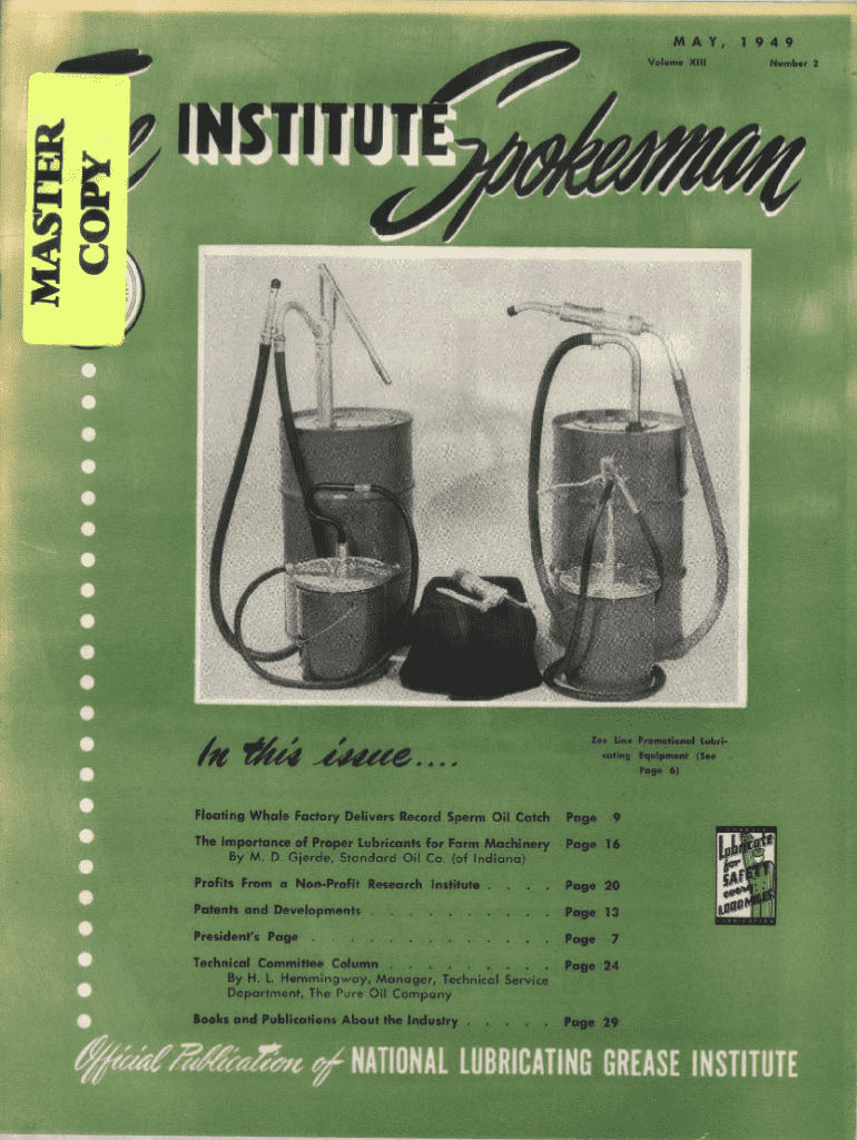 MAY, 1949 Volume XIII 1I ST4&Ilt44 i,te.Zee Line Promotional Lubricating Equipment (See Page 6)Floating Whale Factory Delivers Record Sperm Oil Catch Page 9 The Importance of Proper Lubricants for Farm Machinery Page 16 By M. D. Gierde, Standard Oil Co. (of Indiana)Profits From a NonProfit Research Institute .... Page 20 Patents and Developments .Page 13President\'s Page ....,.,.,,,,, Page 7Technical Committee Column ......... Page 24 By H. L. Hemmingway, Manager, Technical