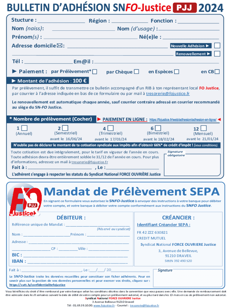 Stucture : Nom (naiss): Prnom(s) : Adresse domicileRgion :Fonction : Nom (dusage) : N(e)le ::Nouvelle Adhsion Renouvellement Tl :Em@il : Paiement : par Prlvement*par Chqueen CBen Espces Montant de