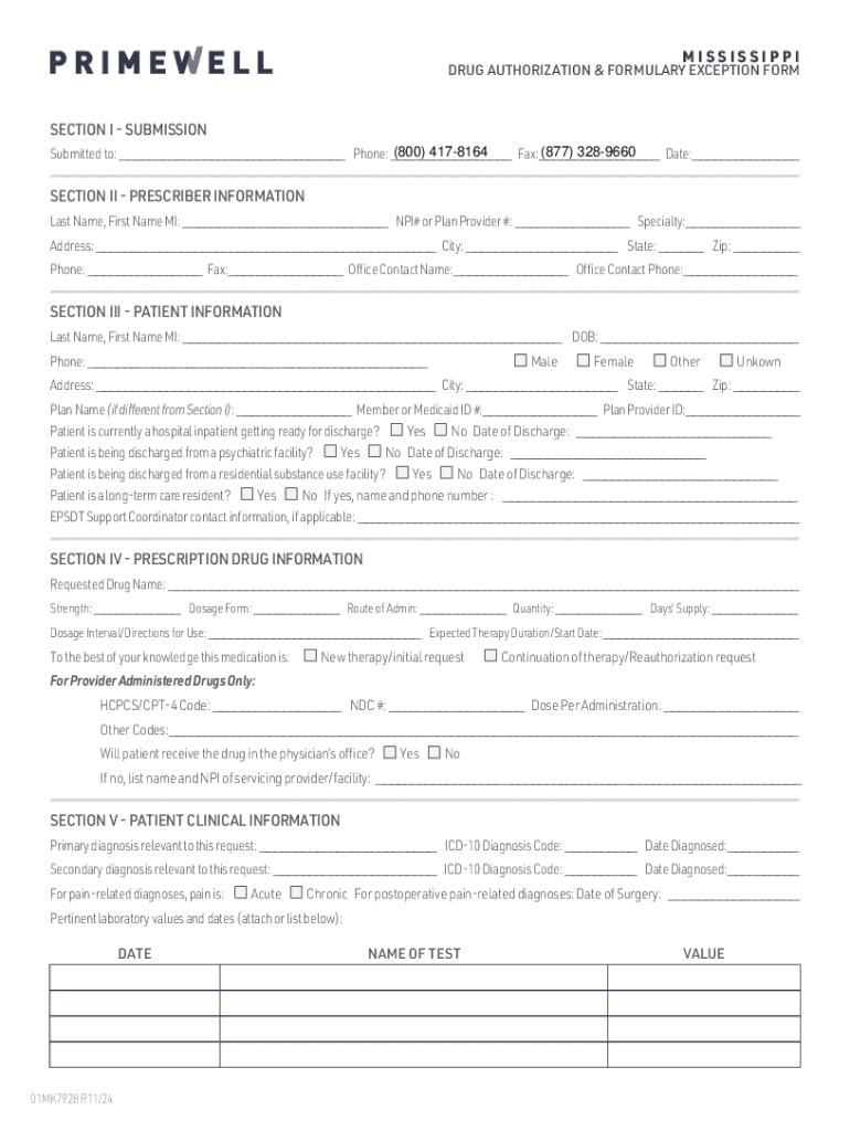 Este formulario se utiliza para solicitar la autorización de medicamentos y excepciones de formulación en el estado de Mississippi. Incluye secciones para la información del prescriptor, el paciente y detalles específicos sobre la terapia solicitada.