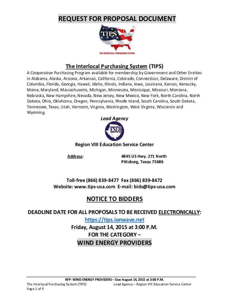 This document outlines the request for proposals related to wind energy providers for the Interlocal Purchasing System (TIPS), aimed at government and other entities in multiple states. It details