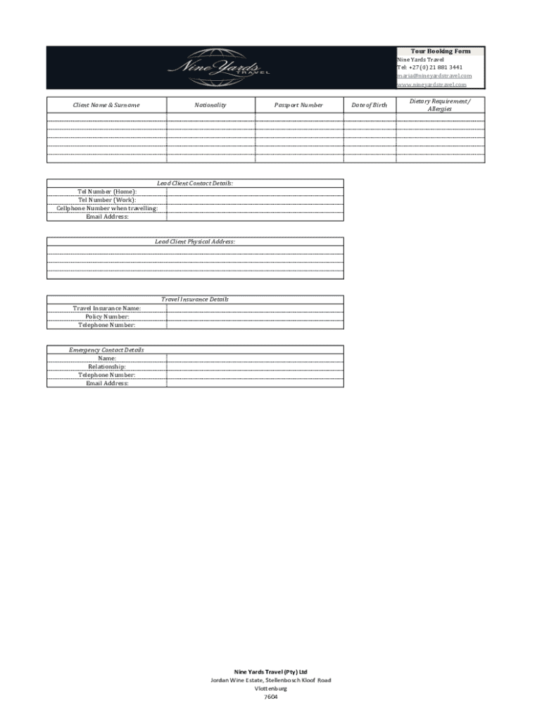 A form used to collect information from clients for booking travel tours, including personal details, emergency contacts, and travel insurance information.