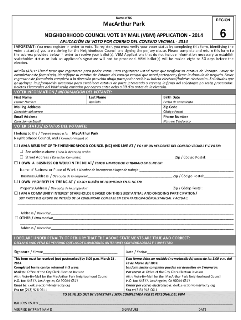 Obtener el gratis Neighborhood Council Vote by Mail Application - 2014