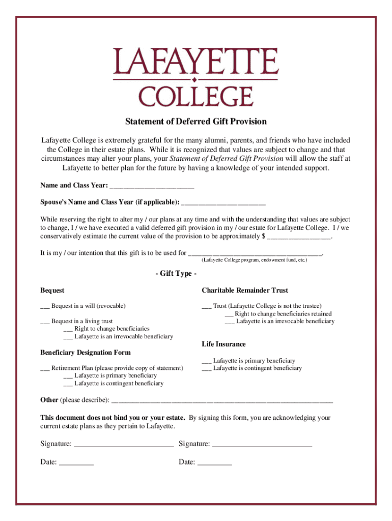 Get the free Statement of Deferred Gift Provision